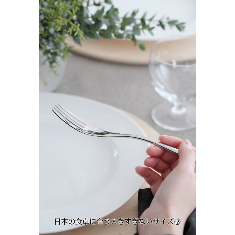 H-ART シリーズには、一回り大きい「テーブルフォーク」があって、本来はそれが食事用なのですが、日本の食卓にはもう少し小さいほうが使いやすいと考え、こちらをセレクトしました。日本製の食事用フォークと近いサイズ感です。