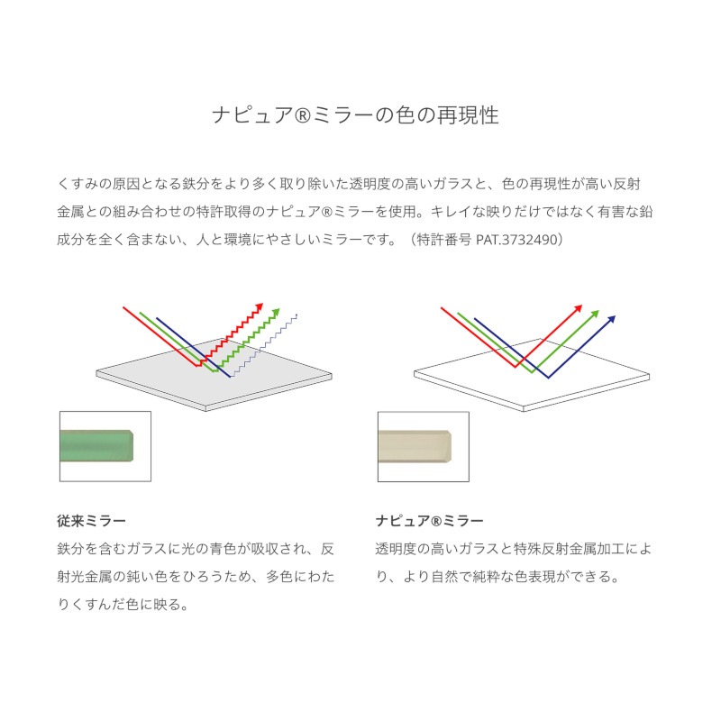 6枚目の画像をご覧いただくとわかりやすいですが、従来の鏡には、実物よりも黄味がかったようなくすんだ色味に映っています。