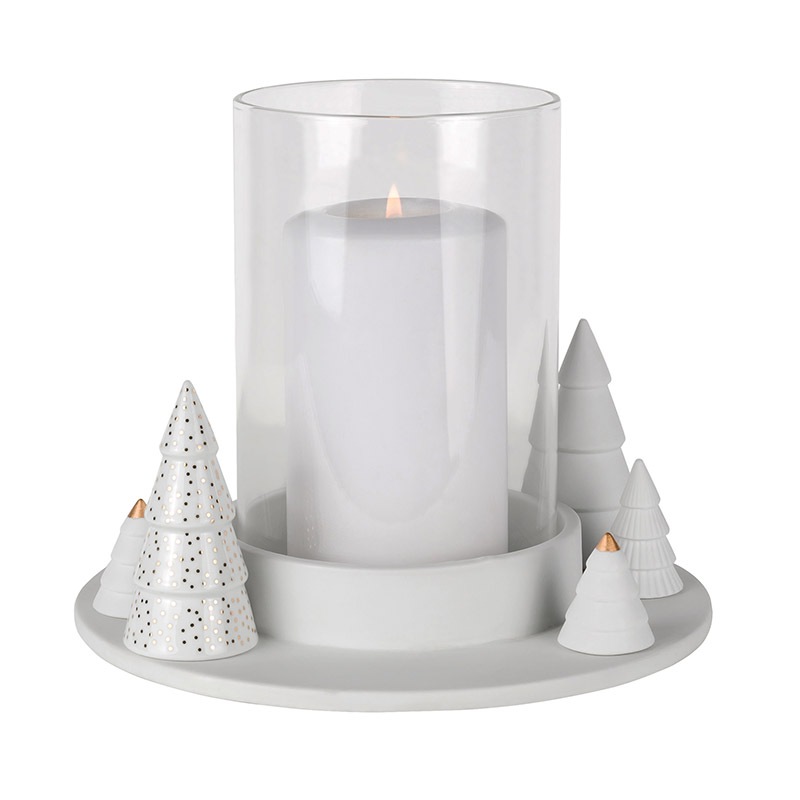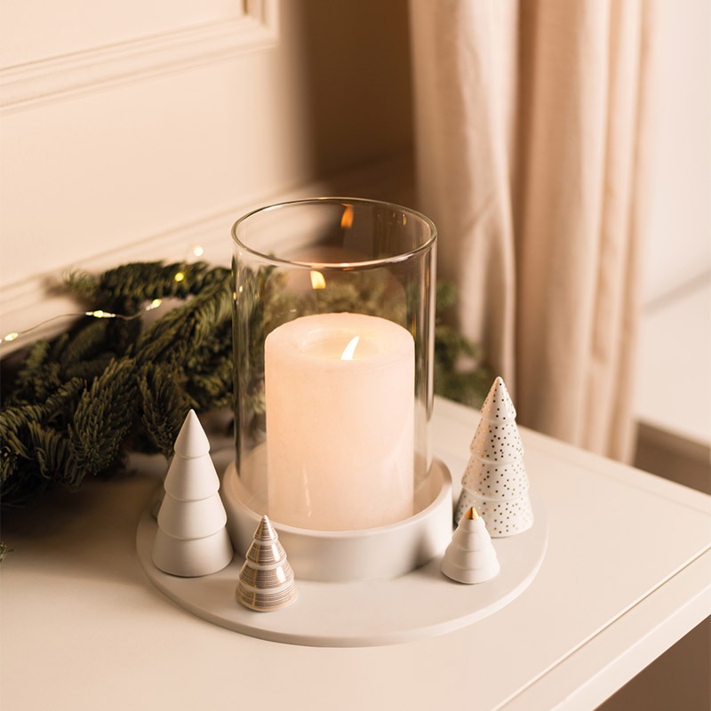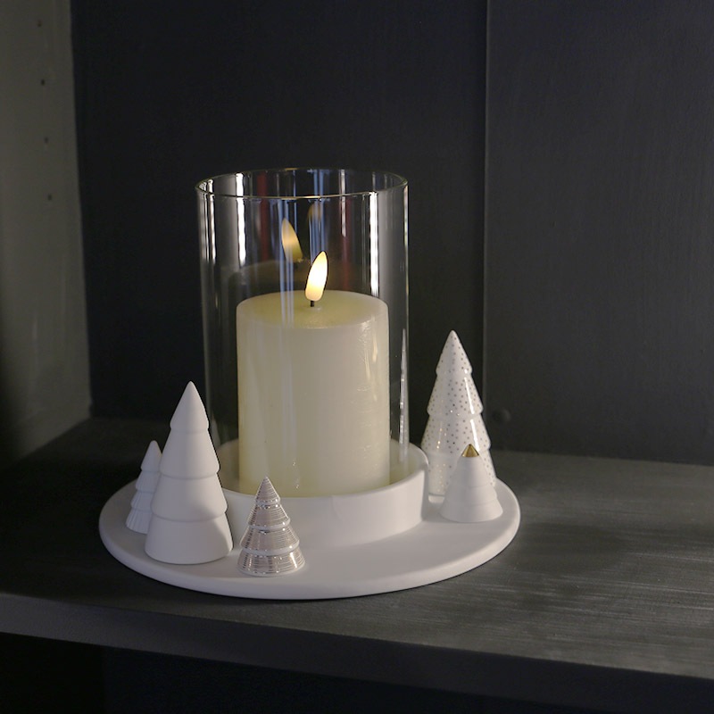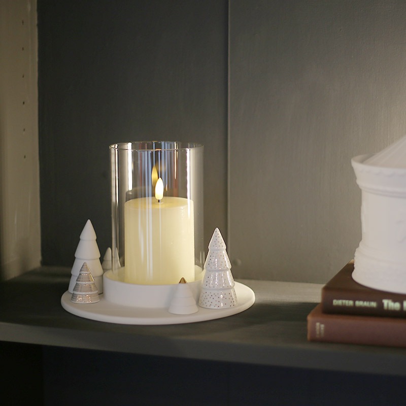 雪が積もったような様々なデザインのツリーがキャンドルをぐるっと取り囲みます。