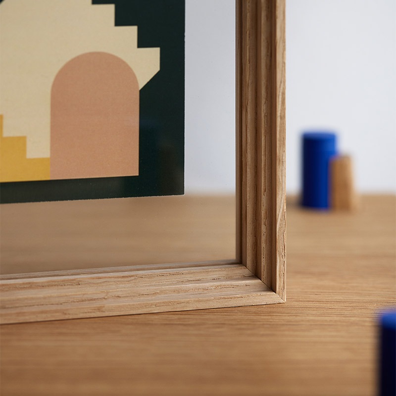 アクリルガラスにアートを挟み、木枠でその四方を囲んで、ゴムで1つにまとめます。