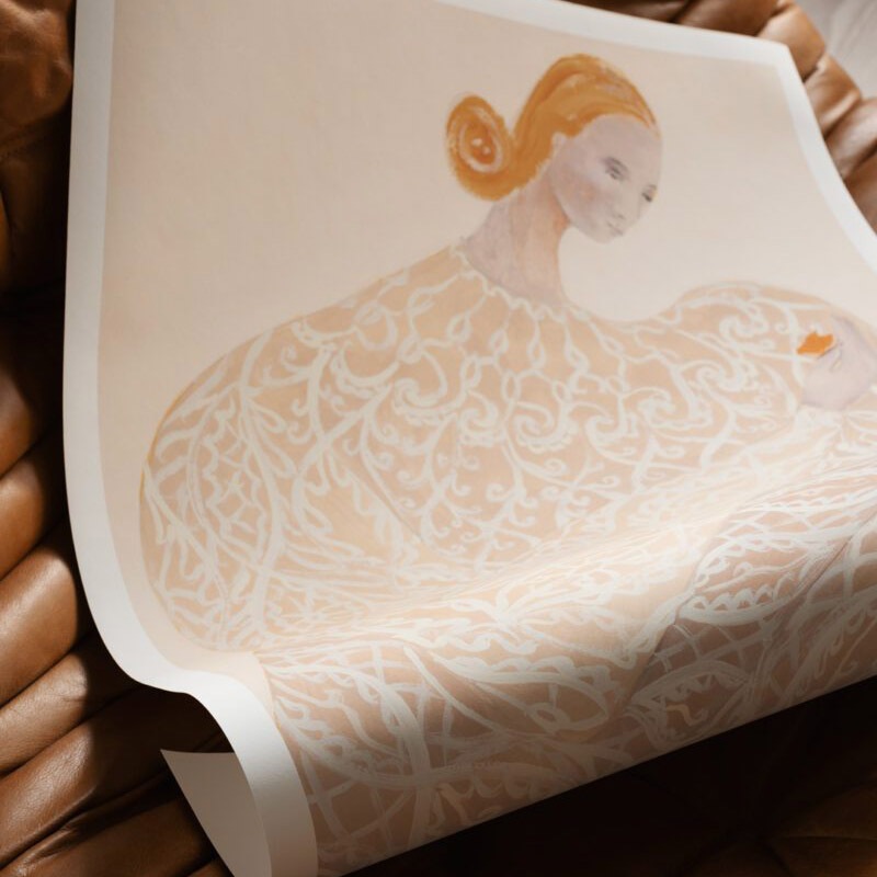 アリエス・牡羊座は落ち着きと細やかさ湛え、豊かな模様のドレスは細部への美意識を表しています。安らぎに満ちた決意の肖像画です。