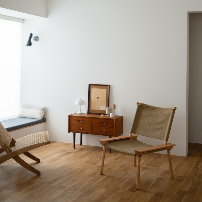 特徴的な肘掛け部分は、ボーエ・モーエンセンのスパニッシュチェアを彷彿させますが、より日本人の体格や日本の家にもしっくりくるデザインのように感じます。