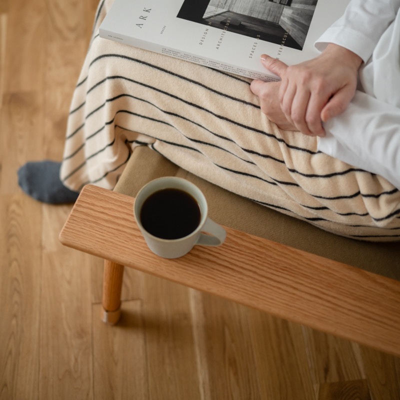 いまインテリアの木材として最も人気があると言っても過言ではない オーク材 x 使い込まれた雰囲気のキャンバス地を使用。