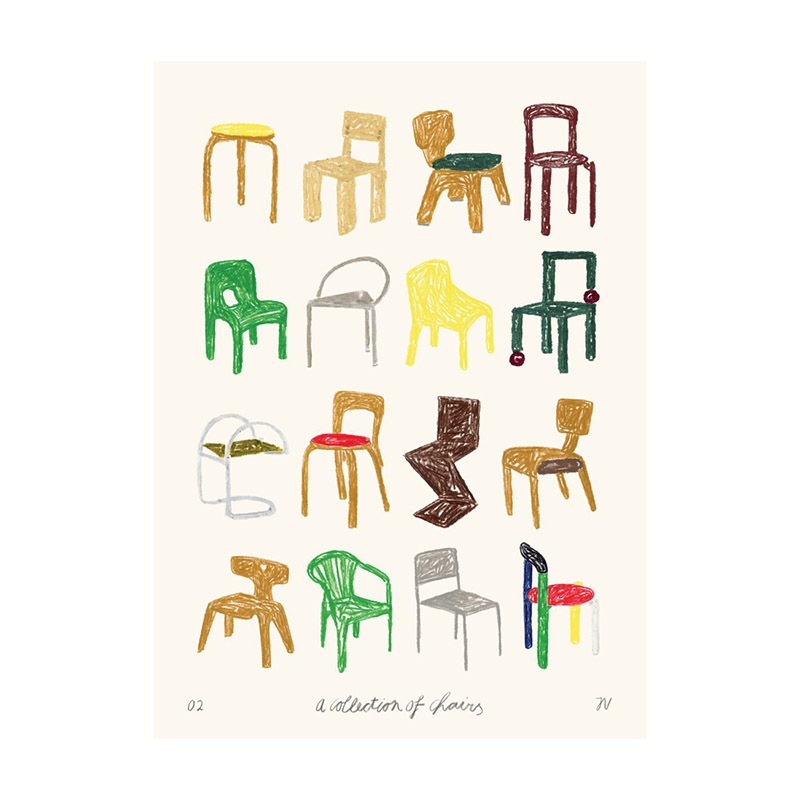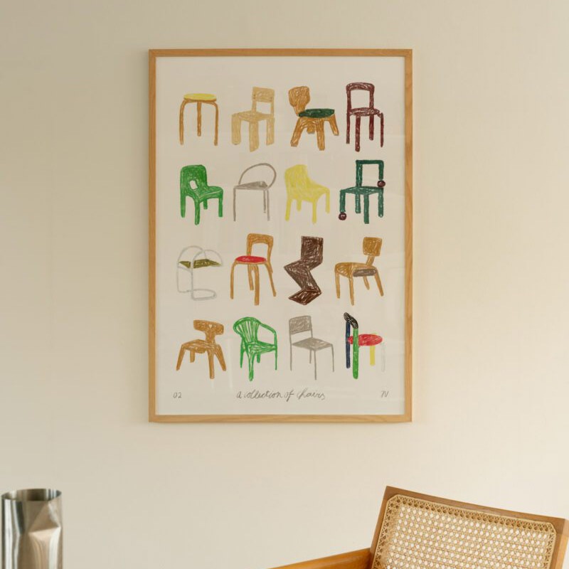 あこがれの椅子たちを、カラフルだけど落ち着いた色使い、遊び心あるタッチで表現した、おしゃれな作品です。